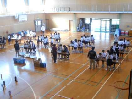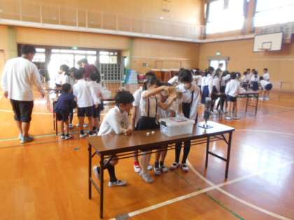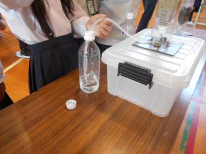 10月16日(月)2・3時間目に水道教室がありました。柴島浄水場の2名の方が、淀川の水がきれいになるしくみについて説明してくださいました。ペットボトルの中に砂の層を使った実験装置と粒状活性炭の装置があり、そこを通ると泥水がきれいな水になったり、においが消えたりしたりしました。装置の中から泥水がきれいな水になって出てくると、子どもたちはとても驚いた様子でした。