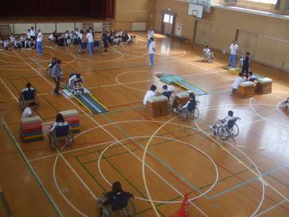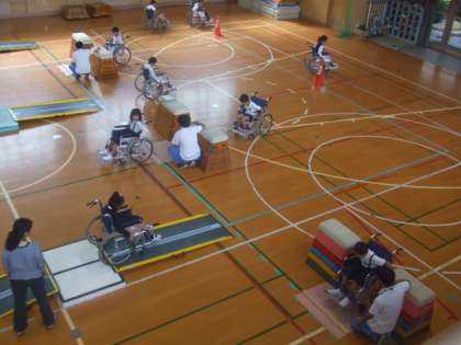説明を聞いたのち、体育館に設置されたコースで、車いすに乗っての自走体験をしました。