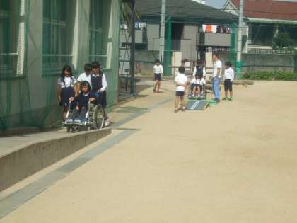 次に、グループごとに分かれて介助体験をしました。体育館から外に出て、北校舎をぐるりと一周するコースをまわりました。