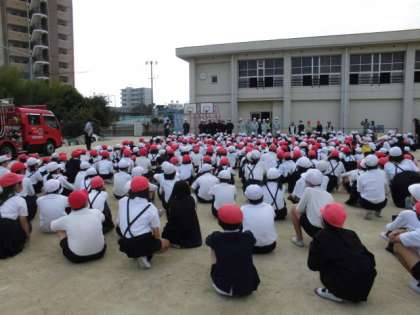 校内放送を聞いた後、すみやかにハンカチで口と鼻を押さえて運動場に避難しました。子どもたちは『お・は・し・も』(押さない・走らない・しゃべらない・戻らない)をしっかり守り避難できました。