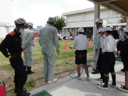 高学年は、初期消火体験として、消火器の操作や放水体験。