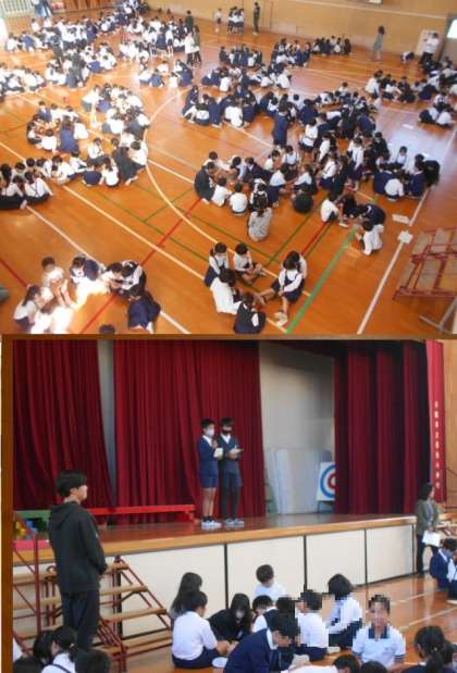 11月1日の児童集会は、「折り鶴集会」でした。最初に6年生の代表が「ピースおおさかに、みんなの作った千羽鶴を持っていきます。一緒に作ってください。」と全員に伝えました。