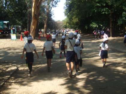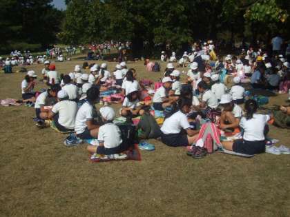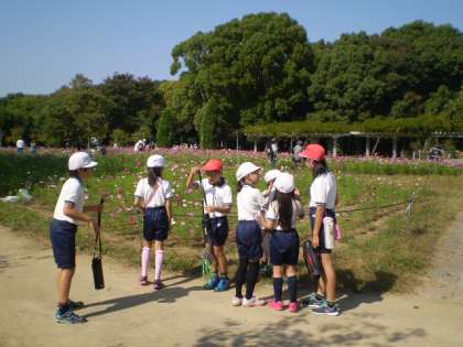 秋晴れの遠足日和だった23日(金)、全校児童で長居公園へふれあい遠足に行きました。学校から長居公園までふれあい班でスタートして、芝生広場に集合しました。午前中の活動はオリエンテーリングです。各ポイントの先生のミッションをクリアしてポイントをゲットしていきます。また、運良くボーナスポイントの先生を見つけると加点されることもあります。