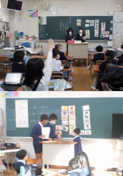 今日の児童集会で、給食委員会のひとが、各学級にいき、給食に出てくる食べ物クイズをしました。班で相談して答えます。1問正解すると、10点で、中に20点問題があります。正解するととてもうれしそうでした。