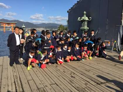 6年生のみんなの切り替えが早く、行動もスムーズで、少し早めに船に乗って宮島へ。ついに日本三景、宮島に到着です!シンボルの鳥居をバックに記念撮影です。