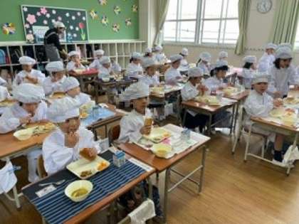 9日(火)から給食が始まりました。1年生にとっては初めての給食です。今日は食器・パンや牛乳は、6年生の子どもたちが運んでくれました。少しずつできるところから自分たちで配膳をします。