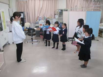 今日は、その中で出てきた教職員の人に話を聞きに行きました。グループで質問を考えて、校長室・給食室・管理作業員室・保健室などに分かれて活動しました。