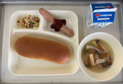 今日の給食では、ゆでたウインナーソーセージにケチャップ味のソースをかけています。