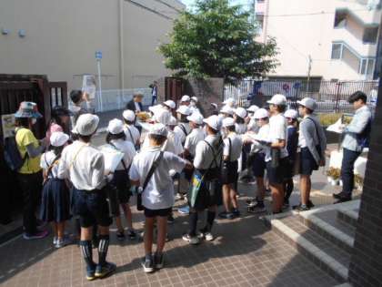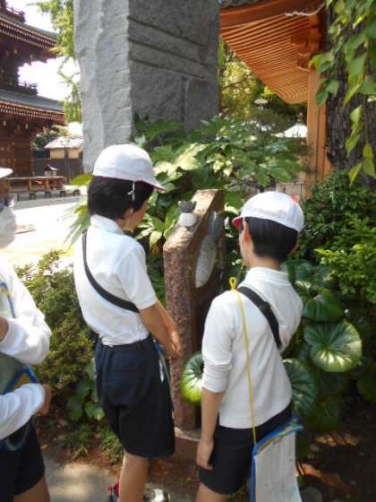6年生が地域の方々をゲストティーチャーにお招きして、田辺のまち歩きをしました。学校前の道がお馬道だったことのお話をスタートに、4班にわかれて、山坂神社や恩楽寺、法楽寺などをまわり、田辺のまちの歴史について話を聞きました。