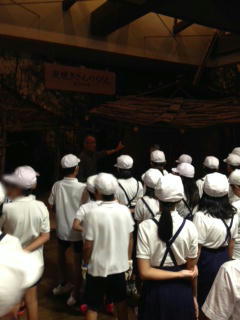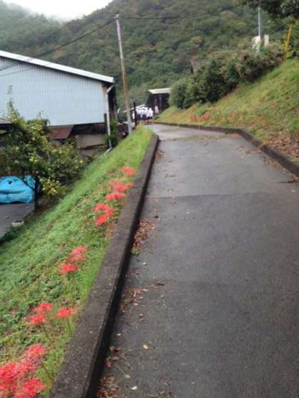 また、その建物のまわりにふと目をやると、ひがんばな(写真左)が咲いていたそうです。この通路を抜けていくと、大きな窯があります。説明を受けた後、グループに分かれて窯だし体験です。