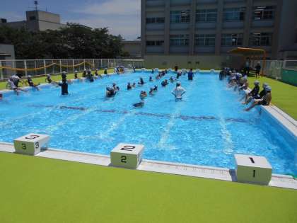 1年ぶりの水泳学習なので、はじめはプールに入るときの注意やルールを確認しました。今日は忍者になって、少しずつ水慣れをしながら学習を始めていました。
