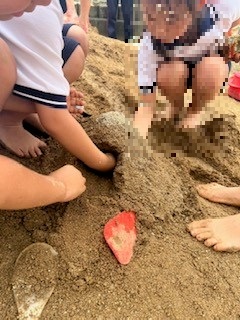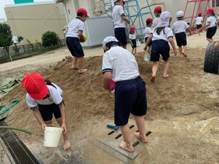 1年生が「どろあそび」をしました。運動場の東側にある、砂山を利用し、上から水を流したり、トンネルを掘ったりしました。みんなでどろんこになってとても楽しそうでした。