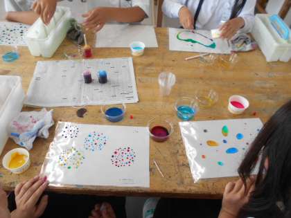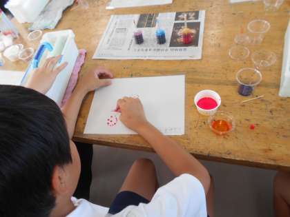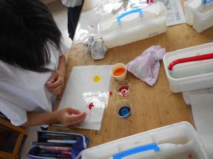6年生が図画工作科で「造形あそび」をしました。カップにインクを入れ、水で濃さを調整したら、シートの上にしょうゆさしで作った色水を落として爪楊枝で模様を作っていきます。落とす水の量を変えてみたり途中で色を混ぜてみたりと工夫してそれぞれの素敵な作品を仕上げていました。最後にみんなで鑑賞をして終わりました。