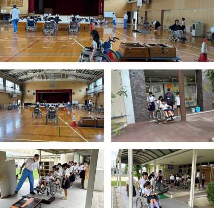 初めに、自分で車いすに乗って車輪を動かしてみました。思うように進まなかったり、段差に苦労したりしていました。次に、グループに分かれて車いすを押す体験をしました。体育館を出発してからプールの横を通って、ナッケ広場を回ったあと、体育館へ戻りました。途中で「段差があります。」や「曲がります。」などと声かけをしている姿も見られ、貴重な体験をすることができました。