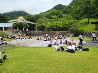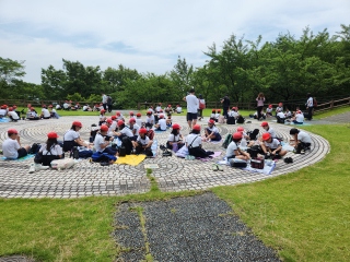 活動班ごとに弁当を食べています。