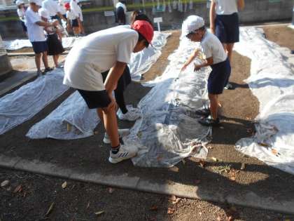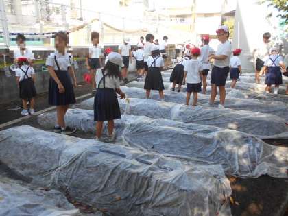 毎年、1年生が慣れるまで6年生が一緒にお世話をしてくれてます。水をペットボトルに入れるところから、畑に水をかけるところまで付き添っている場面が見られました。朝から微笑ましい場面が多くみられました。これが長池小学校の伝統ですね。これからどんどん6年生がリーダーとして、頼もしく感じられるようになります。