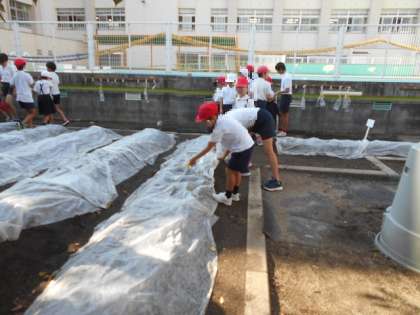 先週木曜日に、田辺大根の種を植えました。はじめのころは水やりが大切で、担当曜日が決まっています。金曜日の水やり担当は、1・6年生が担当します。