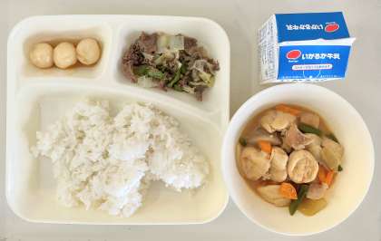 ☆今日の給食には、「一口がんもとさといものみそ煮」と「みたらしだんご」がでました。