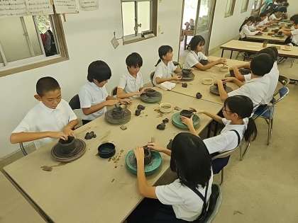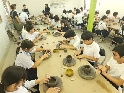一人一人ろくろを回して、湯飲み、お椀、お皿等を作りました。