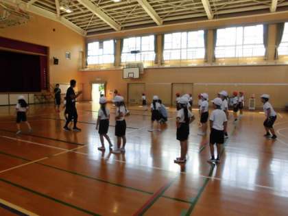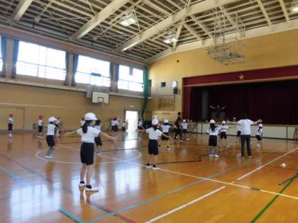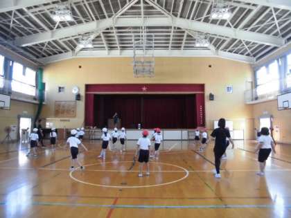 体育支援の講師の先生にきていただき、2年生がリズムダンスをしました。いろいろなテンポの曲に合わせて体操をしたり、身体慣らしの運動をしたりしました。手を広げたり閉じたりしながら、足はグーチョキパーにしたりするなど、複雑な動きもありましたが、子どもたちはリズムに乗って楽しく運動することができました。