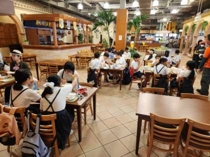 そろそろランチタイムです。班ごとにいくつかの店から選んだ店で好きなメニューを食べています。