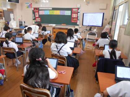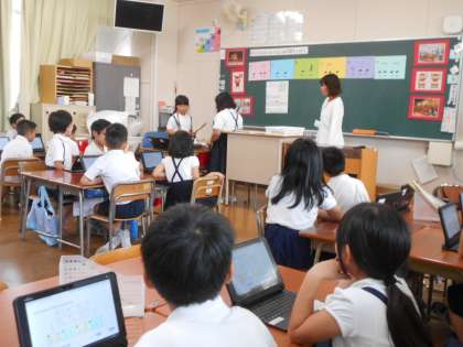 2年生の音楽の授業を、阿倍野区の先生がたくさん観に来られました。今日はたいこを使って、繰り返しのリズムでおまつりの音楽をつくる学習をしました。タブレットを使って、「ドンドコ」や「ドコドン」などいろいろなリズムを組み合わせ、繰り返しのリズムをつくりました。その後はペアでリズムをつなぎ合わせて、一緒にたいこを叩いていました。