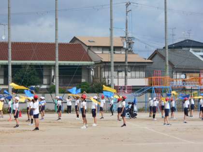 6年生は運動場でフラッグを使った動きの練習をしていました。少しずつ動きが揃うようになってきています。