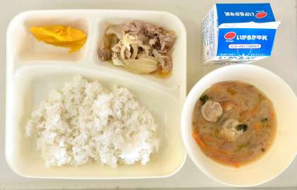 今日の給食は、いわしだんごとだいこん、ごぼう、にんじん、みつばなどが入った汁ものです。