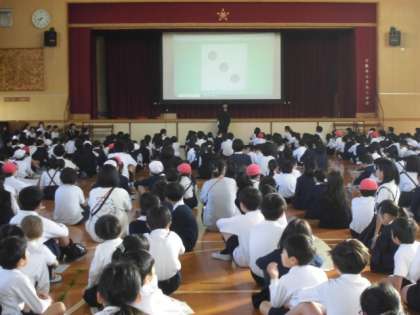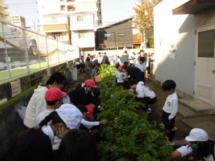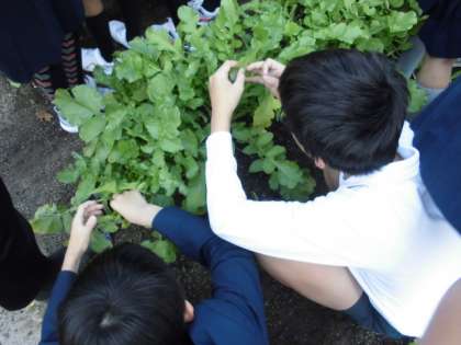 朝の集会の時間を使って、ふれあい活動をしました。大根の葉に虫がつかないように虫取りをしたり、間隔が狭くなっているところの間引きをしたりしました。葉の後ろや根本など虫がいないかしっかりと観察していました。