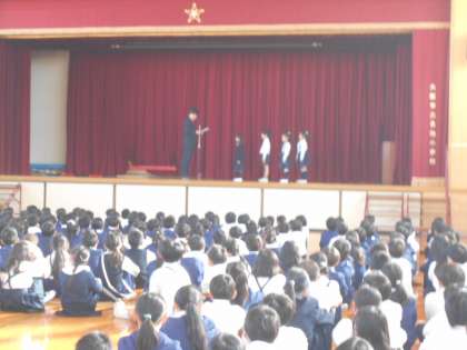今日の朝会で、夏の絵画作品の表彰を行いました。校長先生からは、先週に引き続き、みんなが使うものを次の人に気持ちよく使ってもらうことや、寒くなってきたことによる登下校の歩き方についてお話がありました。