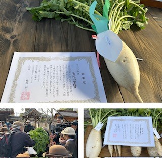 地域や多くの学校から、それぞれ育てた田辺大根を品評会に出品し、今年の優秀田辺大根を決めました。長池小学校からも、みんなで大事に育てた田辺大根を持参し、参加者に投票していただきました。結果は、見事に「でっかいde賞」を受賞することができました。