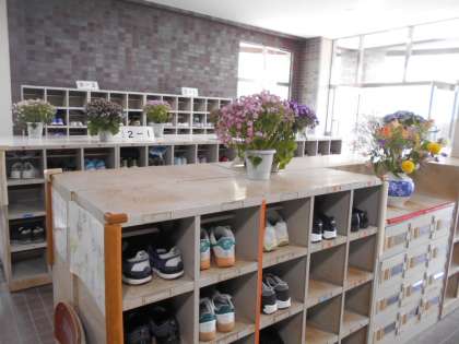 玄関にも色とりどりの花を飾っています。