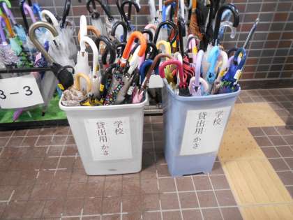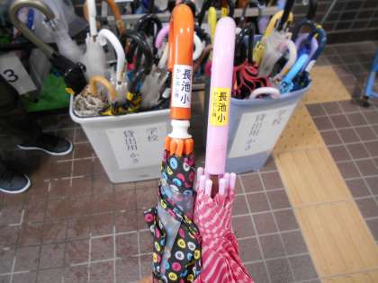 急な雨だったので、傘を持ってきていない児童が多く、貸出用傘を持って帰ってもらいました。傘にはこのようなシールが貼っています。水曜日に返却をお願いします