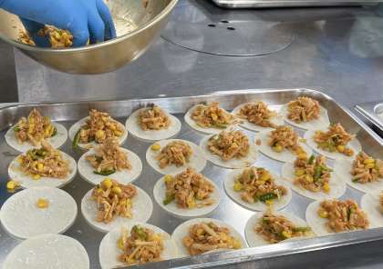 給食の変わりピザは、ぎょうざの皮に新食品の「乳なしチーズ」とツナ、コーン、ピーマン、ピザソースを混ぜ合わせた具をのせ、焼いたものです。
