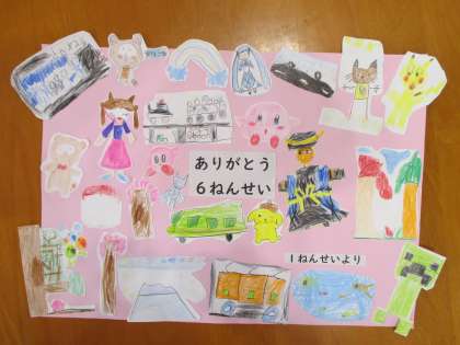 給食の運搬から、掃除の仕方まで、お世話になった6年生に1年生からプレゼントを渡しました。まだ、文字(ひらがな)を全部習っていないので、自分が大好きなものの絵を描いてプレゼントしました。