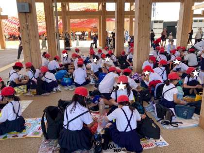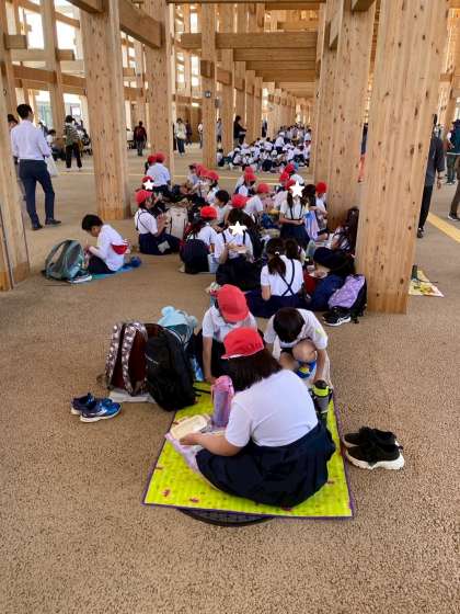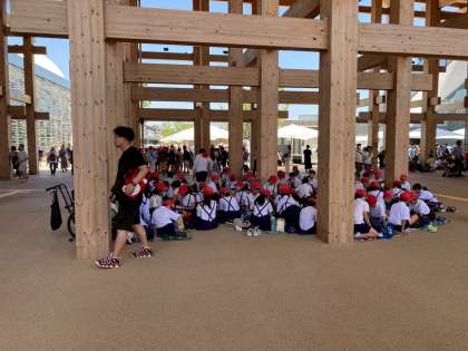 お弁当タイムです。大屋根リングの下の陰になっているところで食べました。