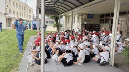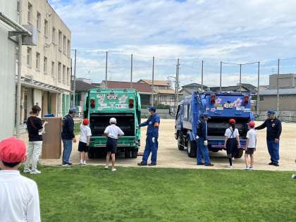 次は、運動場へ出て、実際にパッカー車にごみを入れる体験をさせていただきます。