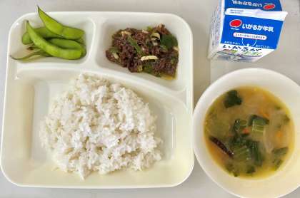 給食では、牛肉とピーマン、たけのこをいため、砂糖やしょうゆ、オイスターソースなどで味を付けています。