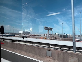 ? 学校を出発しました。常磐入口から阪神高速に入りました。非常にいい天気です。