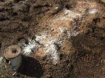 先日、6年生が「腐葉土」」と「堆肥」を混ぜてくれましたが、今日は職員作業として、「苦土石灰」と「牛糞」を土に混ぜこみました。