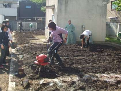 長池小学校には、小型耕運機(「こまめちゃん」とよんでいます)があり、広い農園を耕す時に大活躍をしてくれます。