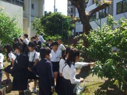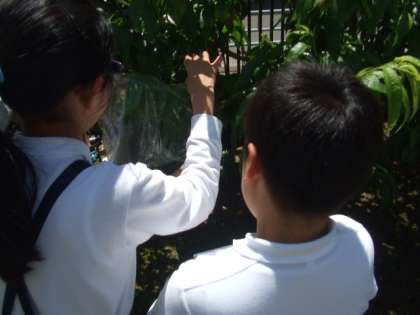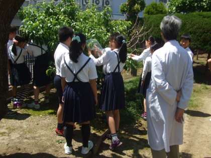 6年生も理科の学習で植物の学習をしています。晴れた日に、木の葉にビニルの袋をかぶせて、その袋の中の変化を観察します。今日は、その学習には絶好の天候となりました。1時間ぐらいして見に行くと、袋に水がたまっていたり、ビニル袋がくもっていたりしていたので子どもたちもよくわかったようでした。