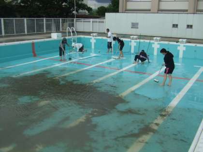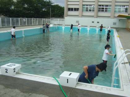 いよいよ15日からプール水泳が始まります。今日は、教職員でプールの中をきれいに清掃しました。最初はよごれのたまった水で、臭いもきつかったですが、最後は元どうりのきれいなプールになりました。プール学習が始まるのがとても楽しみになりますね。