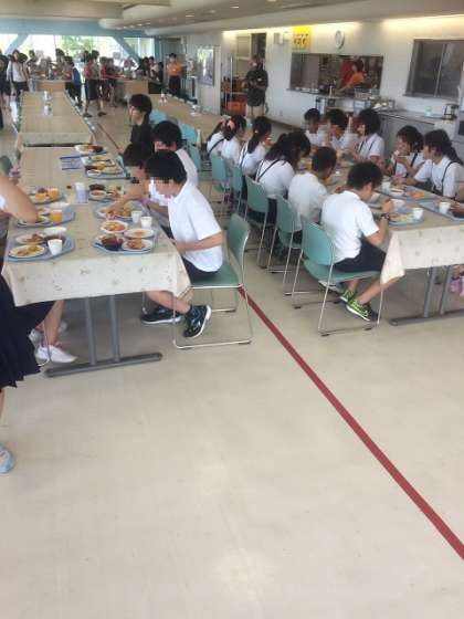今回の自然体験学習での最初の食事です。なんといっても楽しみは食事ですね。交流の家では、施設内での食事はすべてバイキングです。それぞれ思い思いのおかずを自分でチョイスして食べます。みんな元気にしっかり食べているようですね。
