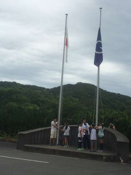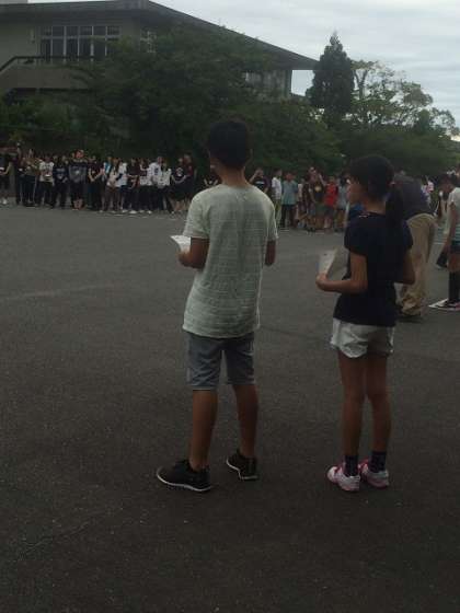 毎回、長池小学校の代表も旗係には参加しますが、今回は司会も長池小学校の番でした。宿泊している学校が順番に、自分たちの学校の紹介をしました!「ナッケカーニバル」や「田辺大根祭り」についてマイクを使わずに発表できたそうです。さすが長池の子どもたちですね!