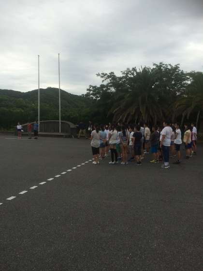 一日の体験活動が終わって17:00です。青少年交流の家では、毎日こうして決まった時刻に、同じように宿泊しているすべての団体が集まって、つどいを行うことが慣例となっています。こうしていろんな学校や団体の人たちとふれあうことができるのも、この自然体験学習の素晴らしいところです。