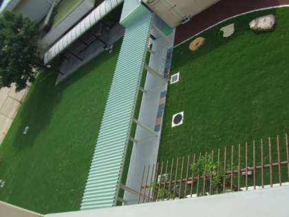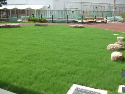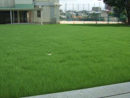 6月27日にみんなで植えた芝生が元気に育っています。晴れた日が続くと枯れないか心配になりますが、雨が降った後はすごく伸びたような気がします。今は、立ち入り禁止になっていて見ているだけですが、早く芝生の上で遊びたいですね。