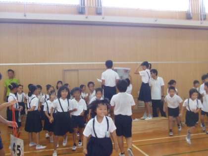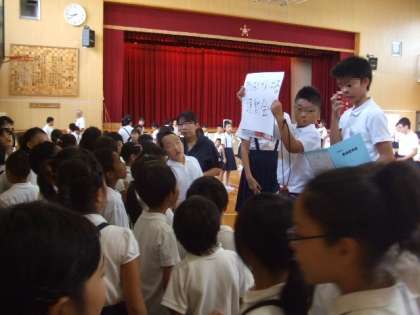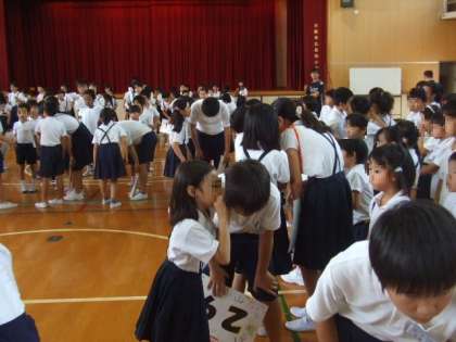 7日(水)今学期最初の児童集会がありました。今日は、伝言ゲームでした。班の代表の人が、前で集会委員が見せる文を急いで間違えずに伝えていきました。