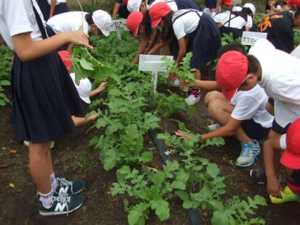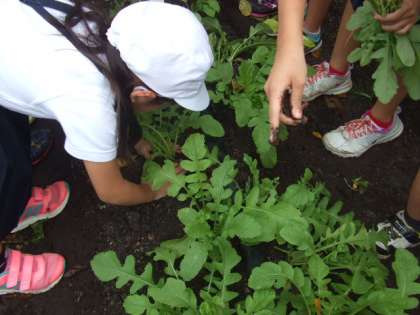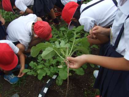 5日(水)ふれあいタイムがありました。台風が近づいていたので心配でしたが、雨も降らず活動できました。今日は、大きくなってきた田辺大根をもっと大きく育てるために、3本から2本に間引きしました。思っていたよりも根の部分が長くなっていてビックリしていました。まっすぐに育つように土寄せをしました。