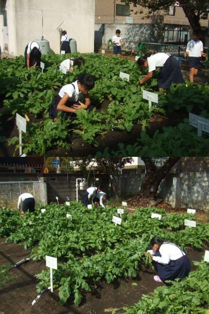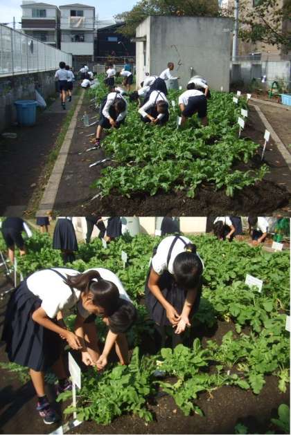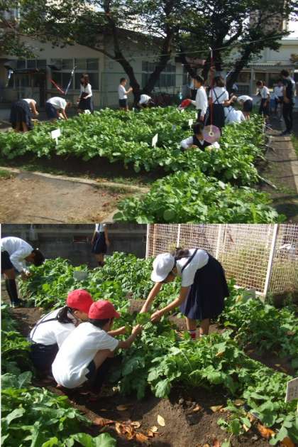 天候や行事の関係で「ふれあいタイム」が少なくなっていました。そうしている間にシンクイムシ・アオムシ・アブラムシなどの虫がどんどん発生して大根の葉が大変なことになっています。しかし、さすが長池小学校の子どもたちです。水やりの当番でない日もたくさんの児童が、休憩時間などに世話をしています。